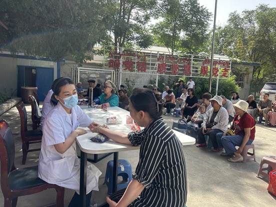 5月29日上午,在端午节来临之际,221团职工医院的益阳援疆医疗队医师在吐鲁番市高昌区友谊巷社区为当地群众开展义诊活动,为当地少数民族群众送去温暖与健康关怀。