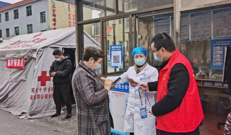 疫情防控工作开展以来,院班子成员及时组织相关人员对工作进行复核,不断进行流程优化,合理安排人员,分组明确工作职责,强化了预检分诊、发热诊室管理,合理配置人员,各科室抽调精干力量参与预检分诊、核酸采样工作,发热病人严格执行“闭环管理”,每个科室预留过渡病房。“您好,请您配合测量体温、戴好口罩、扫场所码、出示健康码和行程码、请问您14天内是否外出。”在该院预检分诊门口医务人员、志愿者、保安对进入医院的所有人员进行严格筛查,发现红黄码人员及时登记上报,把好医院入口关。预检分诊工作看似简单,但实际上困难重重,一位医务人员同笔者说道“来到这个岗位我才知道并不是预想的只是测测体温、填个表那么简单。疫情期间患者到医院就诊必须先测体温、用手机扫码、查看14天行程和健康码,如遇老年患者不熟悉用智能手机及眼花看不清表格文字,就必须帮助他们细致讲解每一个操作步骤,逐句念给老人听......一个上午下来未能喝上一口水。”