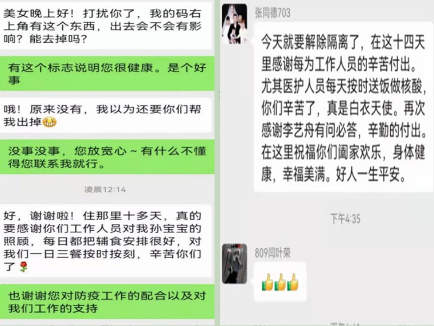 我是一个把工作和生活分得很清晰的人,但自从到了隔离点,工作和生活是彻底分不开了,手机24小时不敢关机,连调成震动或是静音都不敢,仅仅怕隔离对象需要我。我们建立了隔离人员群,方便大家反馈隔离生活的需求和喜怒哀乐;我与所有隔离人员都加了微信,方便大家能及时联系到我,尽可能让大家心安。