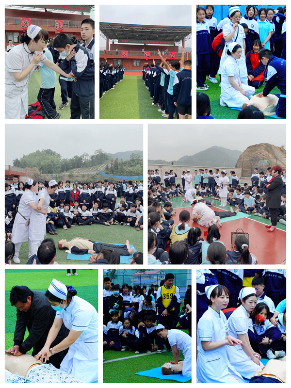 一次志愿服务。5月11日,护理团队走进梅城镇中学东华分校,为全体师生开展以“护佑人民群众健康‘救’在身边”为主题的急救知识培训。讲师们详细地讲解急救理论知识后,分成11个组对接两个班级现场展示心肺复苏、溺水急救、海姆立克急救操作要点,讲师演练完成后,现场指导学员们进行“实战”操作练习。通过生动具体的实列,示范操作、现场演练等方式,让大家切身感受专业急救过程,进一步巩固所学知识。