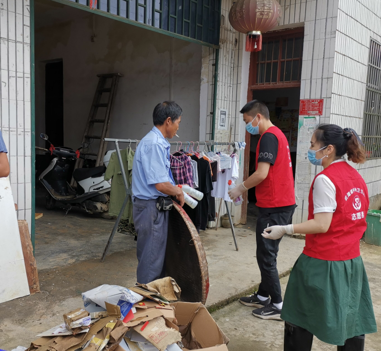 有的地方道路被毁被淹,车辆难以通行,志愿者们就背着药品器械,趟过洪水泥泞。每到一个受灾村庄,志愿者们都会发放传单,宣传防疫防病知识,提高群众防病意识,消除群众恐慌心理,向群众分发消毒药品,指导群众做好灾后环境清理和消毒工作,确保灾后不出现疫情和重大传染疾病,杜绝各类公共卫生事件发生。