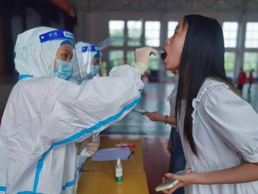 6月5日清晨五点多,该院医护人员早早来到校园,进行核酸检测前的准备工作。“同学们,排好队,前后间隔两米……”在核酸检测现场,医护人员引导学生们有序进行扫码登记,每人采样1分钟内便可完成。