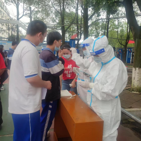 “通过提前对学校老师进行培训,让他们熟知核酸检测流程,便于组织学生快速完成核酸检测。”迎风桥镇卫生院负责人说道。核酸采集现场,“全副武装”的医护人员娴熟地登记、贴管、采样过,身密不透风的防护服下,闷热的天气让他们汗水片刻间浸透全身;学生也全力配合,排着整齐的队伍,秩序井然,核酸采集工作十分顺利、高效。