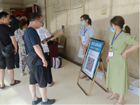 “领导,请你先扫场所码再进入会场”“请自觉出示健康码和行程码”“不好意思,我需要查看一下您的核酸检测证明”,会场卫生监督员正在督促指导参会人员正确佩戴口罩,扫场所码后进入会场。