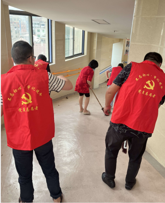 活动现场,党员志愿者们身穿红马甲,不怕脏不怕累,手拿扫帚、簸箕、垃圾桶等工具,有的清理墙面蜘蛛网,有的清理走廊上的灰尘、包装袋等垃圾,在炎热的夏日里干得热火朝天,汗流浃背,但没有一个人叫苦叫累,穿梭忙碌的身影形成了一道亮丽的风景线。整个环境焕然一新。