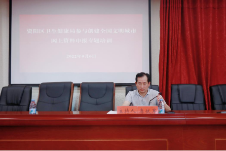 为进一步提高资阳区卫健系统创建全国文明城市网上申报工作水平,9月6日上午,资阳区卫健局举办专题培训班,邀请市创文办周文斌科长就网上资料申报工作作专题授课。全区医疗卫生机构分管院长、创文专干共40余人参加会议。会议由区卫健局党组副书记、副局长李伏军主持。