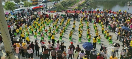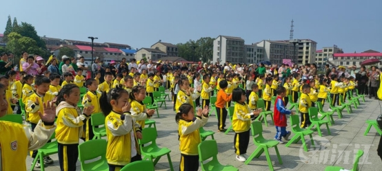 “小朋友们,大家跟着老师一起举起双手……”随着欢快明朗的音乐响起,孩子们和老师一起跟着音乐节奏或是蹦跳,或是拍手,周围不时传来家长为孩子加油鼓劲的呐喊声,整个阳罗洲镇卫星湖文化广场到处洋溢着欢声笑语。