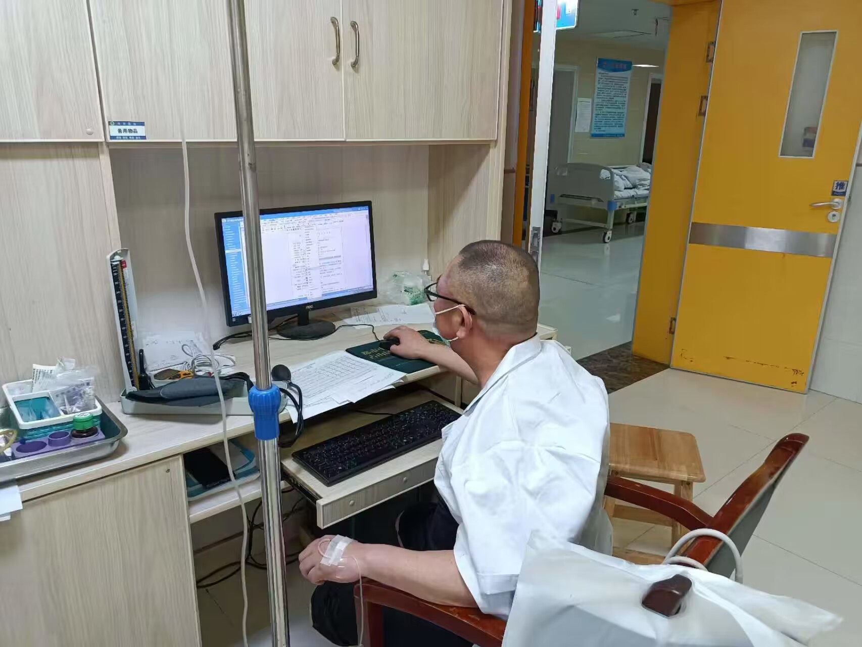 这是一张拍摄于2023年5月30日下午4点左右的相片,一名年近五十岁的医者,左手挂着吊瓶,右手拿着鼠标,目盯电脑屏幕,弓着身子在书写着医疗文书记录。