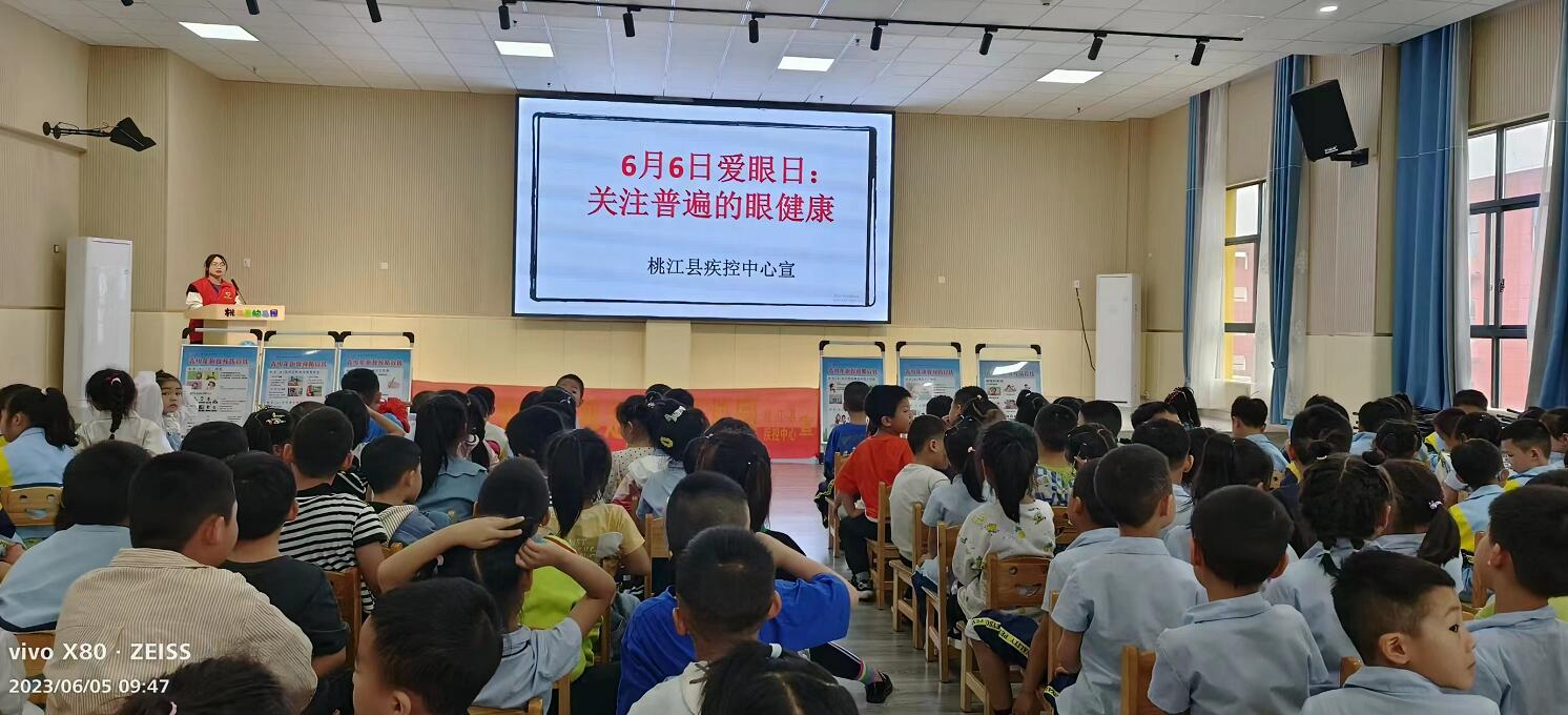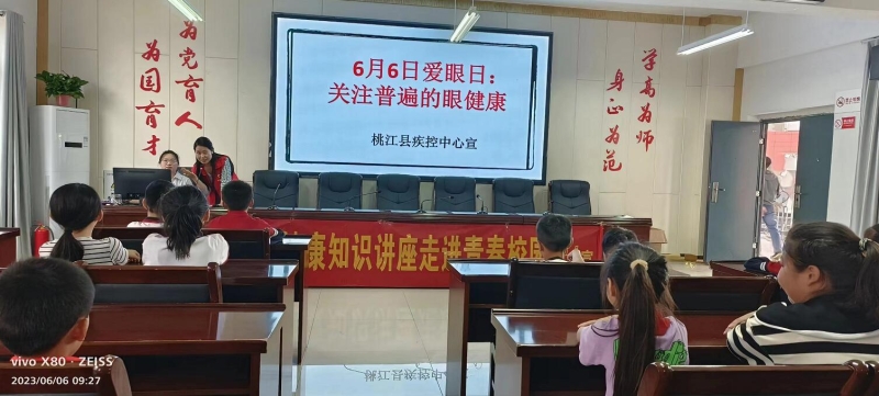 6月5日和6月6日,桃江县疾控中心、桃花江中心医院在桃花江镇中心学校和桃江县幼儿园进行健康讲座,重点讲述了近视的病因和预防,强调“眼部健康要从小开始关注,呵护好眼睛,拥有一个光明的未来。”通过分析当前国家近视防控形势,并重点结合近视发生的相关因素,提炼减负、视觉环境、用眼习惯、体育锻炼、校园科普、视力监测等校园近视防控关键词,向师生们介绍切实可行的防控措施。特别强调了规范的读写姿势的重要性,还提醒同学牢记“20-20-20”法则,即每阅读20分钟,看20英尺(约6米)外的景物20秒,嘱咐大家注意劳逸结合,科学用眼。活动现场分发了800余份宣传资料。