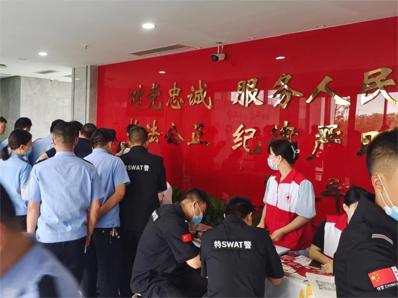活动现场热闹非凡,广大民警、特警同志积极参与献血,卫健系统的医护人员以及红十字会的志愿者现场宣讲造血干细胞捐献知识及捐献流程,发放宣传手册,指导造血干细胞捐献者正确填表,并有序开展采血工作。据统计,本次活动共参与献血75人次,总献血量30000ml,14人填写《造血干细胞志愿捐献者登记表》加入中国造血干细胞捐献者资料库。