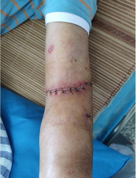 9月2日,刘嗲晚上在家开车库门时,被门上掉落的玻璃割伤左肘部,当即血流如注,立即自己用毛巾包住由家属紧急送入院。手足显微外科袁医师急忙察看病情。只见左肘关节处有一15cm的弧形裂伤,深达骨质,探查发现肌腱断裂,肘肱动脉、静脉断裂,肘正中神经损伤。末端感觉、血运差。情况危急。患者和家属也焦急万分。医师一边安慰患者,一边积极做术前准备。因为患者年老,有冠心病、房颤病史。医师充分考虑手术风险、评估预后,与家属沟通,随后进手术室在显微镜下用比头发丝还要细的线对肱动脉、伴行静脉及正中神经进行了吻合,并对肘部皮肤与手指裂伤皮肤做了精细缝合。手术整整持续了四五个小时,凌晨1点多才结束,手术顺利、麻醉满意。患者后期恢复也较快。经过医护人员精心照护,康复出院。