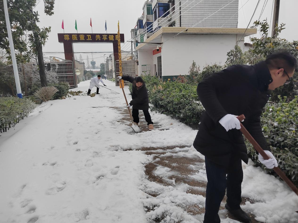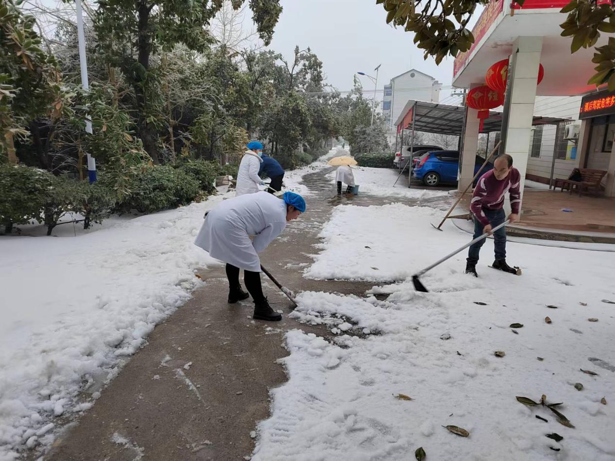 自2月2日湖南省气象台发布低温雨雪冰冻橙色预警以来,大通湖区金盆镇卫生院按照“保安全、保畅通、保平安”的工作要求,提前谋划,认真部署,全院干部职工连续几日为医院内外、各科室上下坡道、人行车道等处进行折断树枝清除、积雪清扫、撒盐除冰等,确保老百姓就医通道畅通,谱写了“金医人”迎战积雪的生动画面。