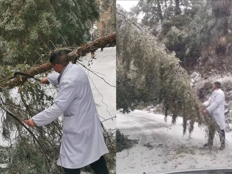 清塘铺镇中心卫生院:医务人员清理“折腰”拦路的树枝
