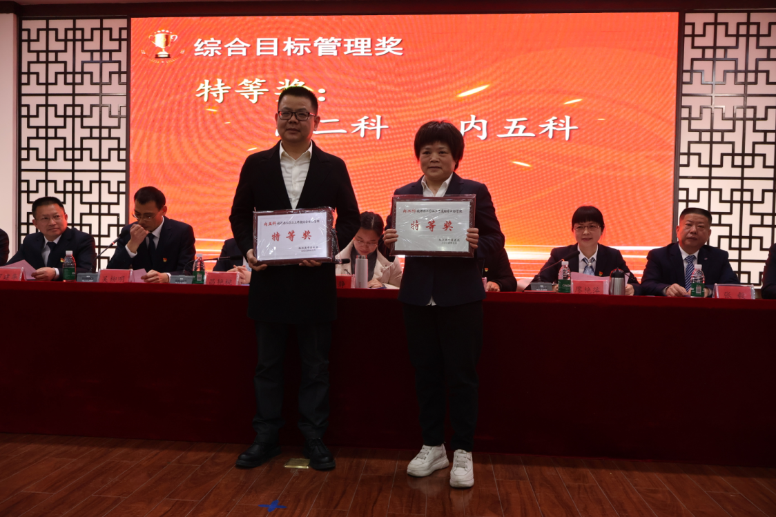 大会对2023年度先进集体、个人进行表彰。院党委委员、副院长吴柳明宣读表彰文件。会上,医院对在2023年度医院各项工作中涌现的先进集体和个人进行了现场表彰。据悉,本次表彰大会共计颁发30个奖项,包括“重点专科建设”“业务科室综合目标管理奖”“医疗安全奖”“职能科室综合目标管理奖”等集体奖项,“重大抢救贡献奖”、“年度最佳敬业奖”、“优秀科主任”等个人奖项。
