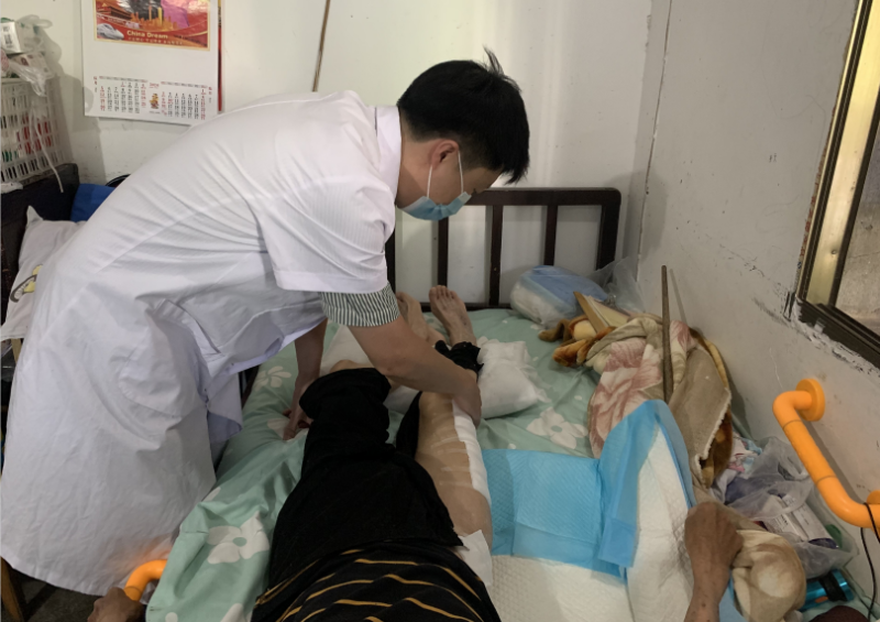 进门后,周医生小心翼翼地拆开纱布,认真查看了老人的伤口情况,仔细地给伤口消毒换药,并在帮助老人整理好衣物后,耐心叮嘱刘奶奶伤口护理、防止褥疮和肌肉萎缩等注意事项。“真的是太感谢你们了,我的行动不便,老头子又不能动弹,家庭医生上门服务真的解决了我们的大难题!”刘奶奶拉着周医生的手激动地说。
