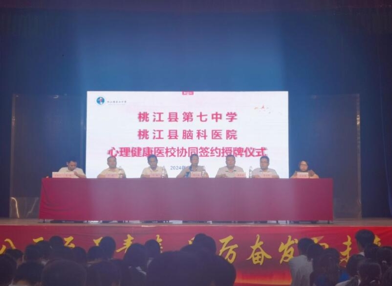 5月27日上午,桃江县脑科医院与桃江县第七中学举办心理健康服务“医校融合”工作签约启动授牌仪式。县教育局副局长胡往胜、县七中党支部书记兼校长龚伟明、县脑科医院党支部书记兼院长刘敏等相关负责人参加。