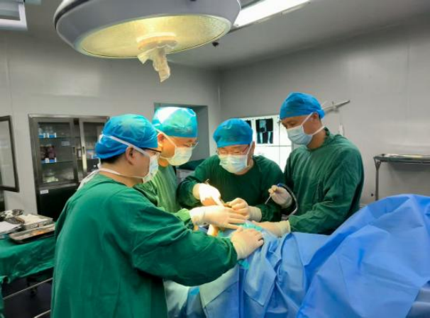 面对复杂病情,沅江市人民医院外科二党支部迅速发挥战斗堡垒作用,第一时间启动多学科协作(MDT)诊疗机制,整合骨科、麻醉科、心血管内科等科室力量,构建“术前精准评估—术中安全保障—术后早期康复”全流程体系。针对两位患者的不同痛点,精准施术、高效攻坚。为94岁患者实施人工髋关节置换术时,团队从切口显露、股骨取出,到假体植入,每一步都精准操作,仅50分钟顺利完成手术。为77岁患者开展全膝关节置换术时,团队严格把控截骨角度、精细调整软组织平衡,精准安装假体,手术历时1.5小时,出血量仅200ml,远低于常规水平,最大程度降低了患者创伤。