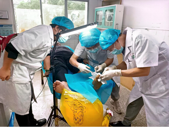 夏某左足外伤感染持续一个月有余,在卫生院初步抗感染治疗效果不佳。考虑到患者年事已高、基础疾病较多,卫生院立即启动医共体专家会诊机制,邀请县人民医院创伤骨科副主任医师杨甲辉进行远程会诊。杨甲辉诊断为“左足第三趾创伤后感染伴跖骨陈旧性骨折,疑似骨髓炎”,并提出清创联合抗感染的治疗方案。为最大限度方便患者、确保疗效,杨甲辉随即通过“专家下沉”机制前往该卫生院,主刀为患者实施了清创手术。术后,患者恢复良好,无需转往县城便得以痊愈。