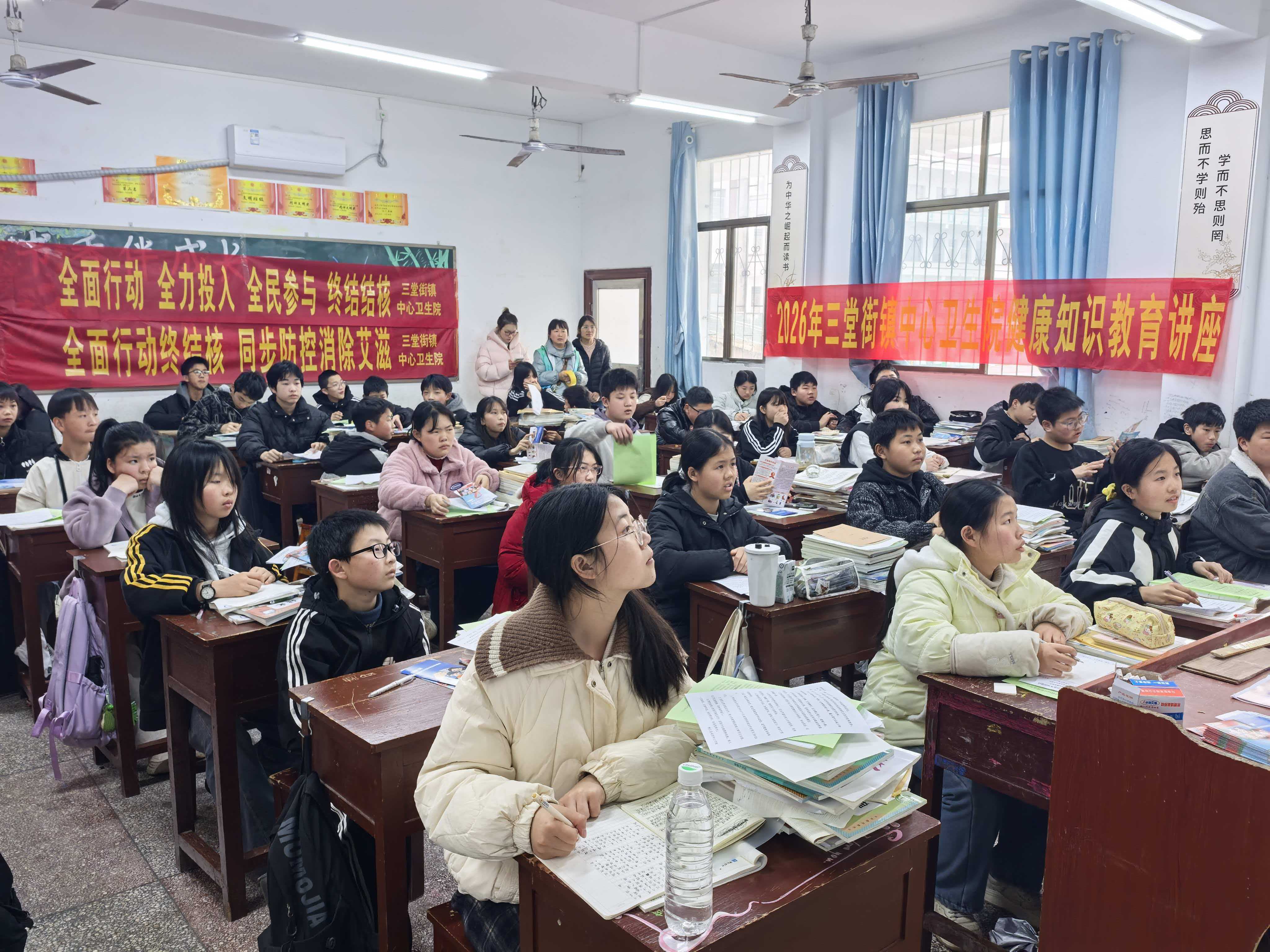 活动中,志愿者们走进三堂街镇中学,举办结核病与艾滋病防治健康知识讲座。工作人员以通俗易懂的语言,向师生介绍了肺结核的典型症状、日常预防要点,以及艾滋病的三大传播途径和科学阻断方法。她还特别讲解中医“正气存内,邪不可干”的防治理念,分享银耳百合汤、穴位按摩等简便易行的中医保健方法。讲座现场互动积极,师生对“早发现、早报告、早隔离、早治疗”有了更深刻的认识。本次讲座共有50余名师生参加,现场发放7种宣传资料共计308份。