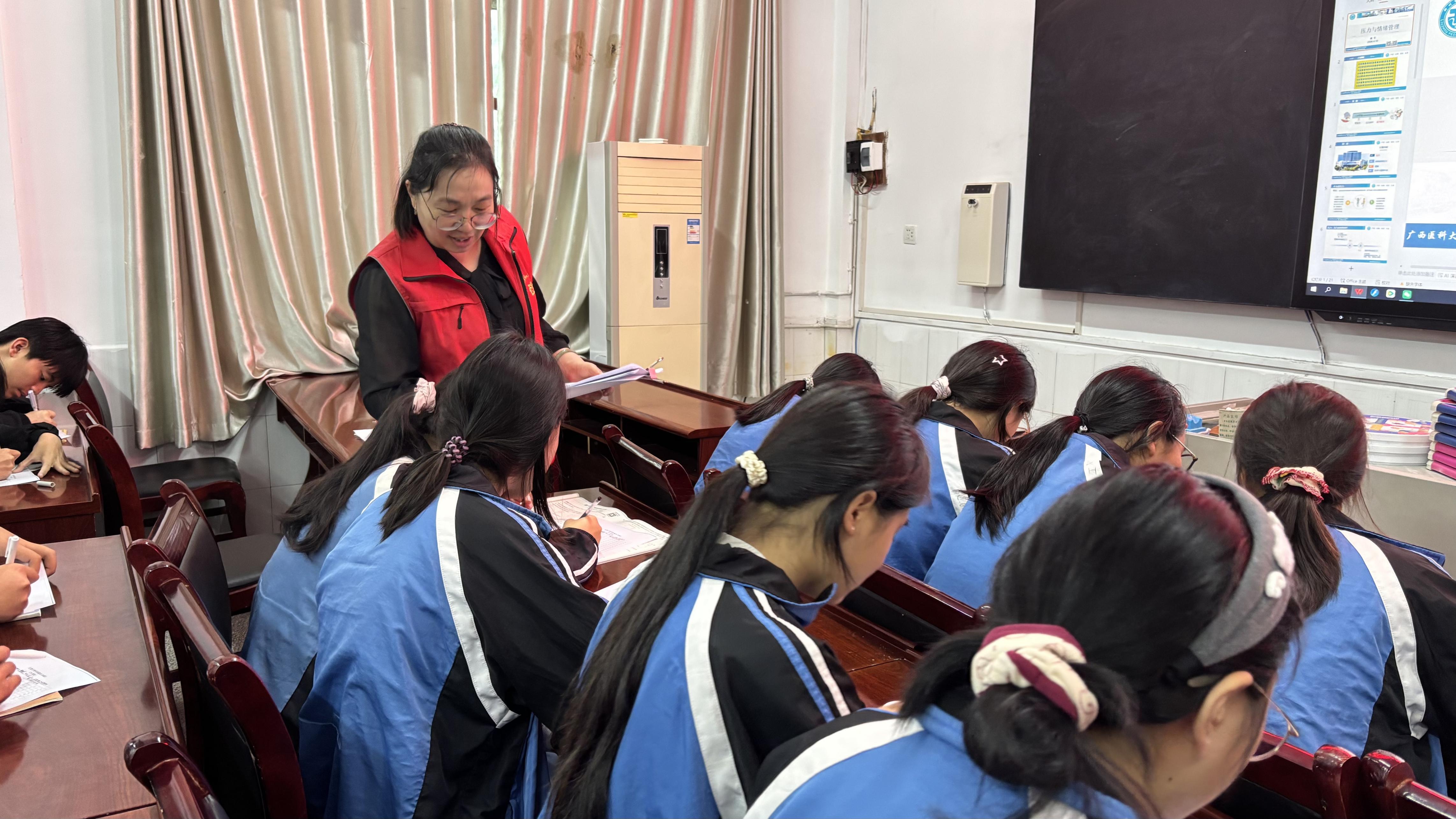 讲座现场,主讲姚医生结合青少年心理发展特点,围绕“压力识别”“压力应对策略”“情绪认知”“情绪共处方法”四大核心板块展开讲解。通过PPT课件展示真实案例,用通俗易懂的语言剖析学习压力、人际交往等常见情绪困扰的成因,同时结合互动问卷调查,引导学生主动分享自身感受,打破心理沟通壁垒。针对如何缓解压力,姚医生从科学角度出发,传授了深呼吸放松、运动宣泄、积极心理暗示等实用技巧;对于情绪管理,重点讲解了如何识别不同情绪信号,以及接纳情绪、调节情绪的具体方法,帮助学生建立积极的心理认知模式。现场学生专注聆听、踊跃互动,在问答交流中解开了诸多心理困惑。讲座尾声,一首“你笑起来真好看”歌曲伴随着姚医生笑着对学生们说:“你笑起来真好看,希望大家都能保持这份灿烂笑容,用积极心态面对生活中的每一个挑战。”温暖的话语瞬间点燃现场氛围,学生们纷纷露出真挚笑容,不少学生表示:“这次讲座不仅学到了缓解压力的方法,更让我们学会了关注自己的情绪,以后遇到烦恼也知道该如何调整了。”
