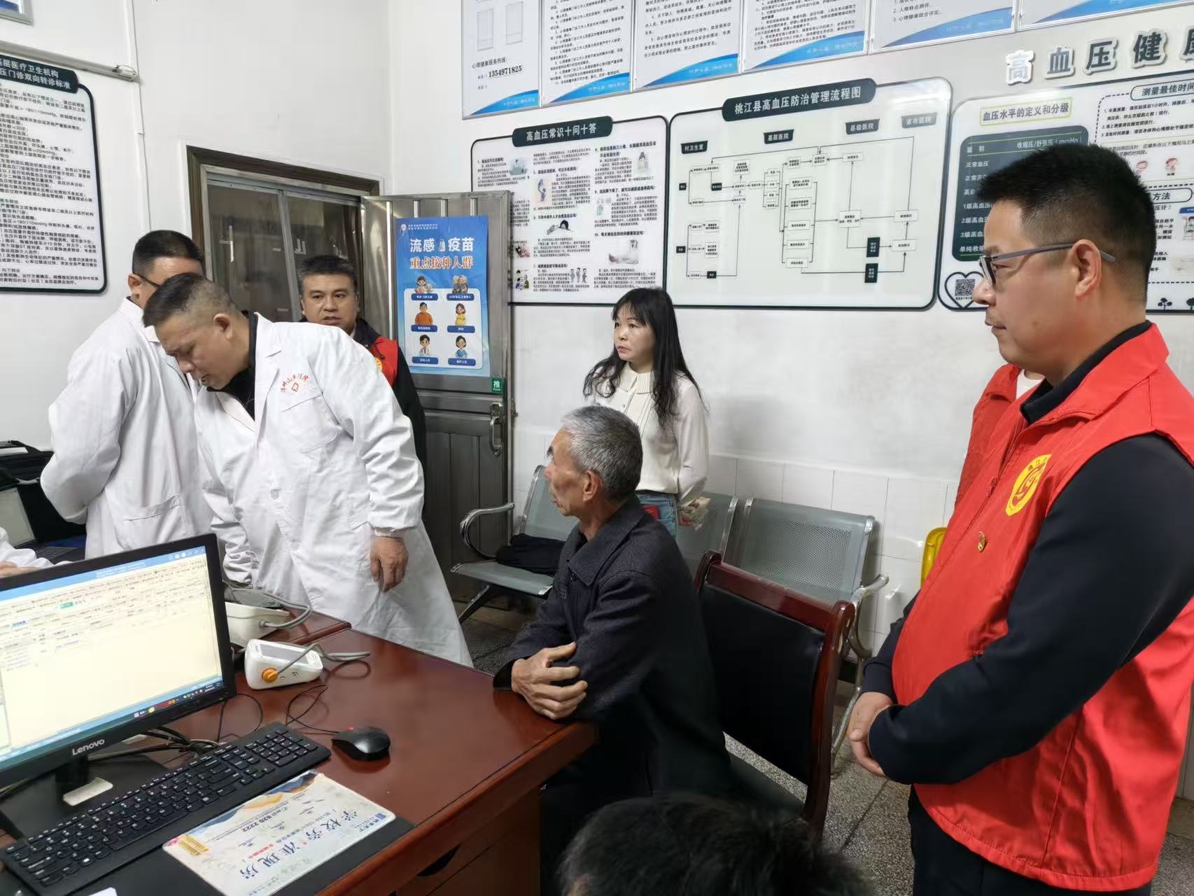 党徽亮在诊台前,服务沉到心坎里。党建不是挂在墙上的,是揣在兜里的听诊器、攥在手里的签约本,一场活动下来,服务队为住院及门诊患者近50余人完成了公卫体检,筛查出需重点管理的高危人群20余人,现场预约复诊10余人。
