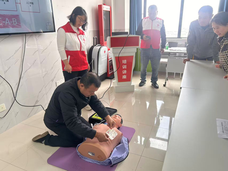 培训现场,红十字资深讲师徐艺红老师结合电力行业高空作业、户外作业易发生触电、心脏骤停等突发状况的特点,采用“理论授课+操作演示”的方式,深入浅出地讲解了心肺复苏的操作流程、自动体外除颤器(AED)的使用方法。